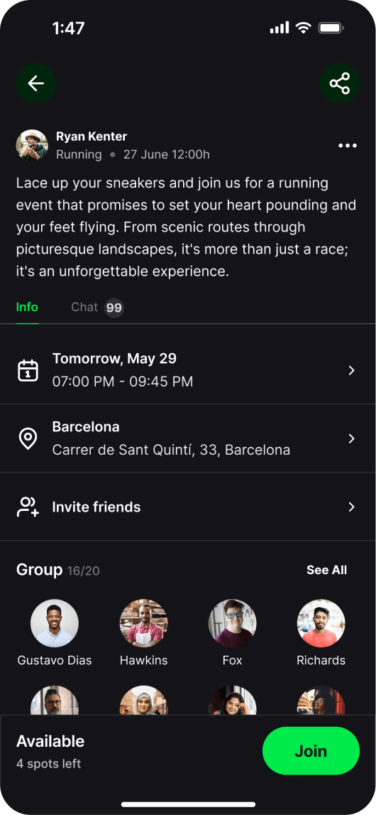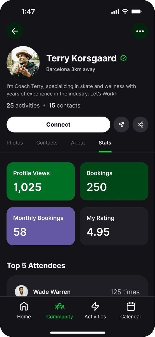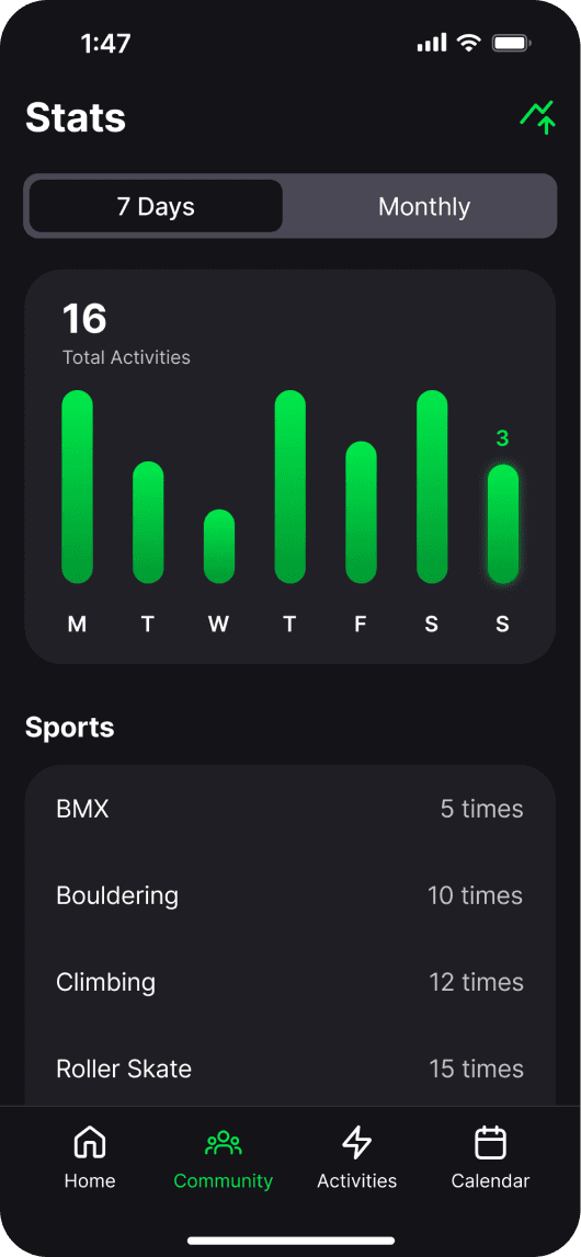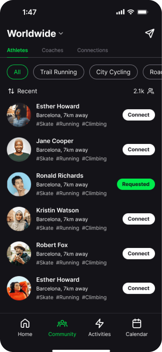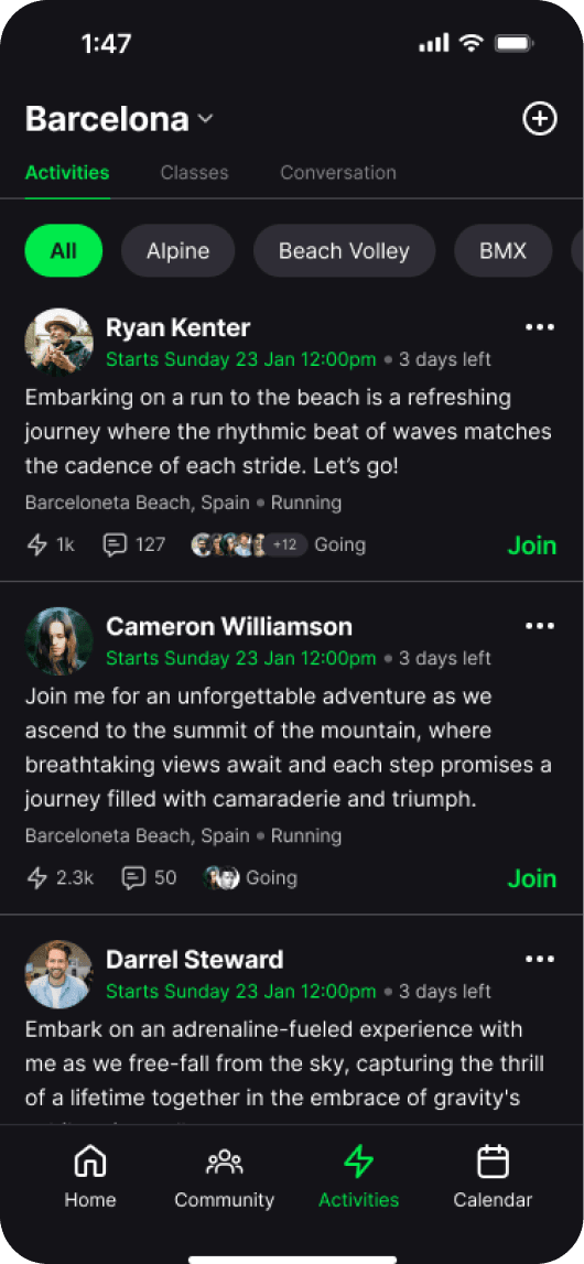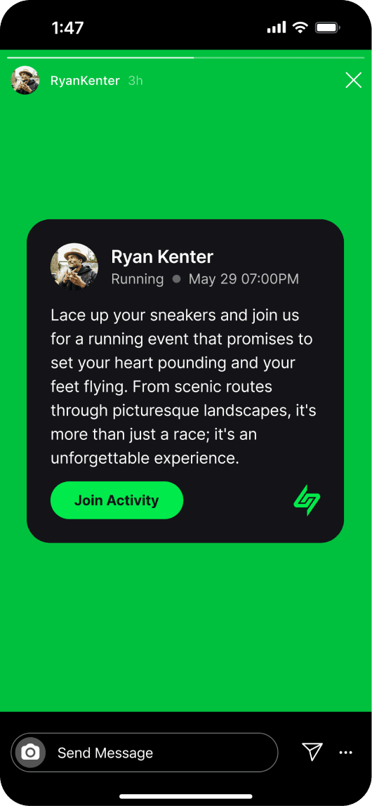 The new design advertises community, coaches and activities to users as well as showing active coaches and athletes within the app, making people feel less alone when browsing. This led to connecting and following one another, as well as joining activities. To boost engagement and app growth, I also added a sharing sticker for Instagram and Snapchat, allowing coaches to promote activities and audiences to return, or download, the app.