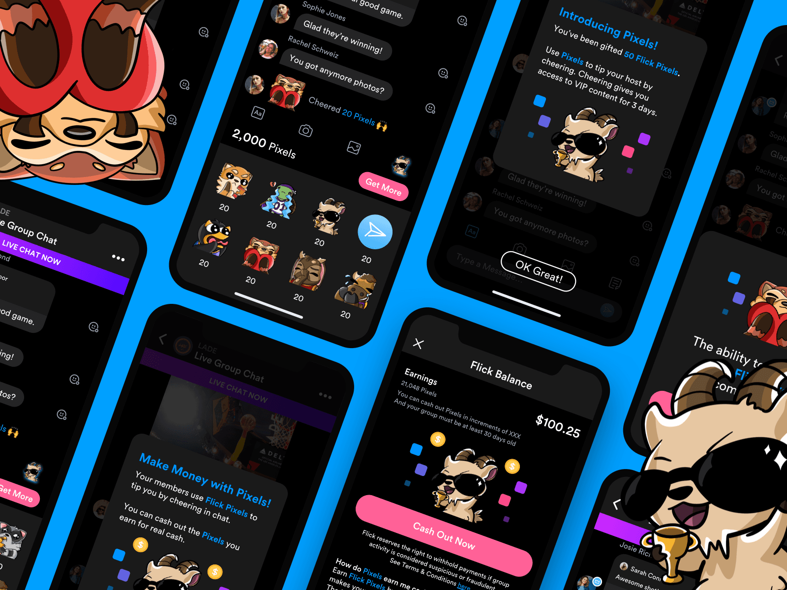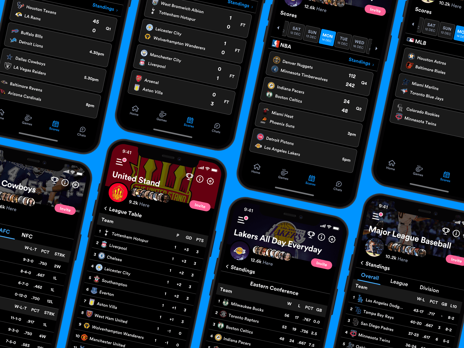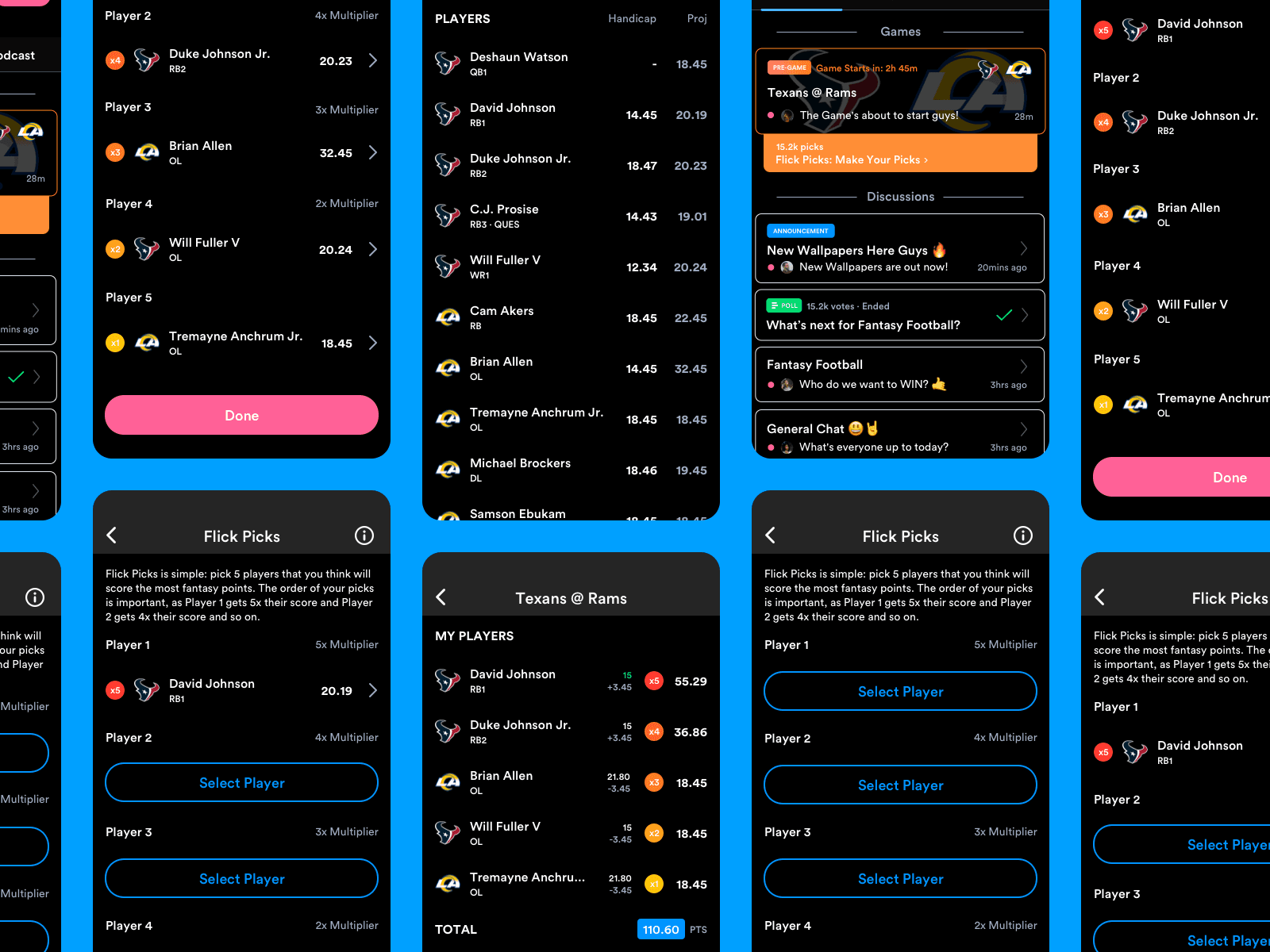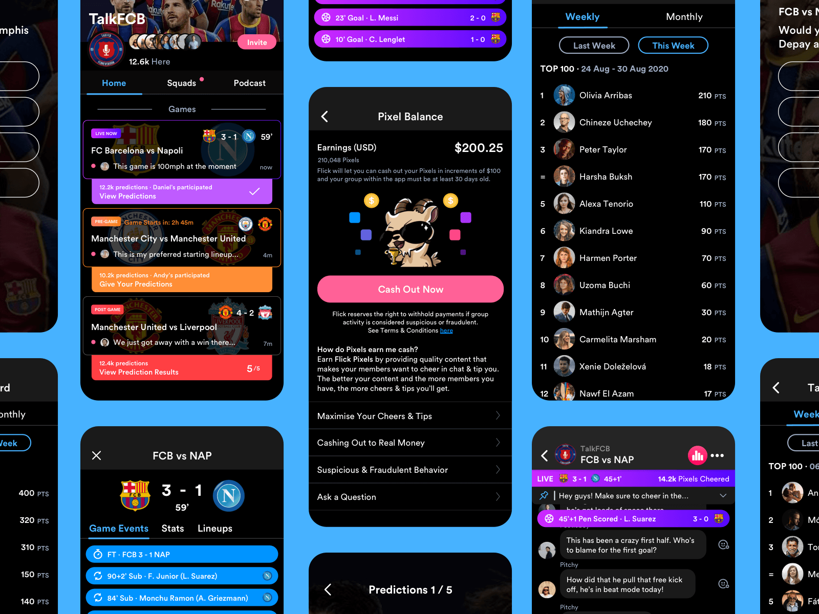 As the sole designer, I crafted and integrated features like chat, polls, league tables and sports stats among several others. I also handled the app's store presence, design, copy and feature releases. Users could access live scores, stats, make game predictions, participate in quizzes and enter jackpot competitions called Flick Picks, covering NFL, NBA and MLB. Sports influencers could earn money by keeping groups they created engaged, while fans could buy our in-app currency, called Pixels, to purchase emojis and cheer within groups.