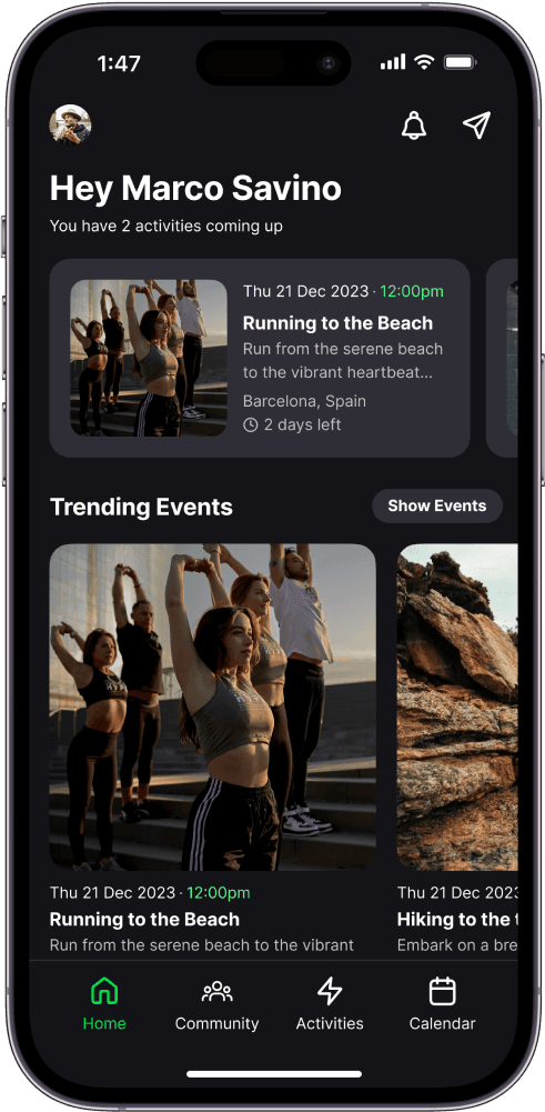 The new design advertises community, coaches and activities to users as well as showing active coaches and athletes within the app, making people feel less alone when browsing. This led to people connecting and following one another, as well as joining each other's activities. To boost engagement and app growth, I also added a sharing sticker for Instagram and Snapchat, allowing coaches to promote activities and audiences to return, or download, the app.
