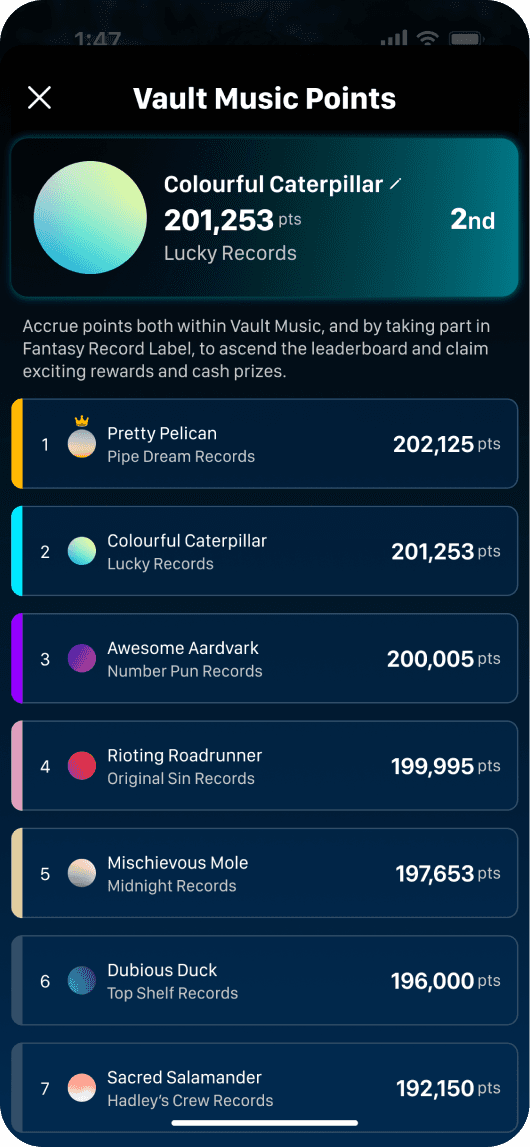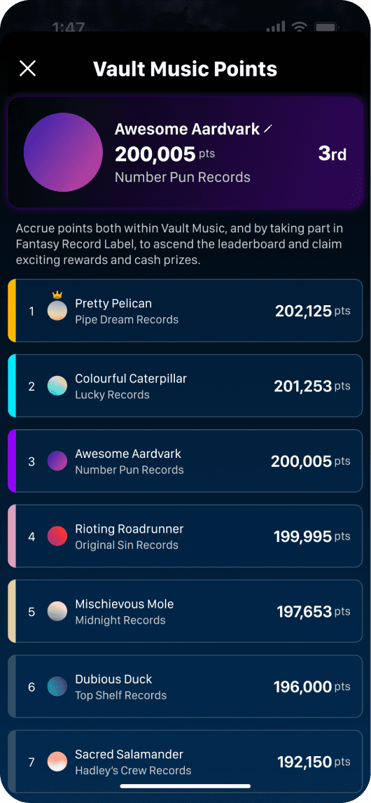 Alongside this, we built Fantasy Record Label where users predicted Spotify listenership, climbed leaderboards and won interesting prizes. As the sole designer, I crafted an intuitive, streaming-familiar experience across iOS and Android, and led the app’s presence across the Apple and Play Stores, designing and optimising standout listings.